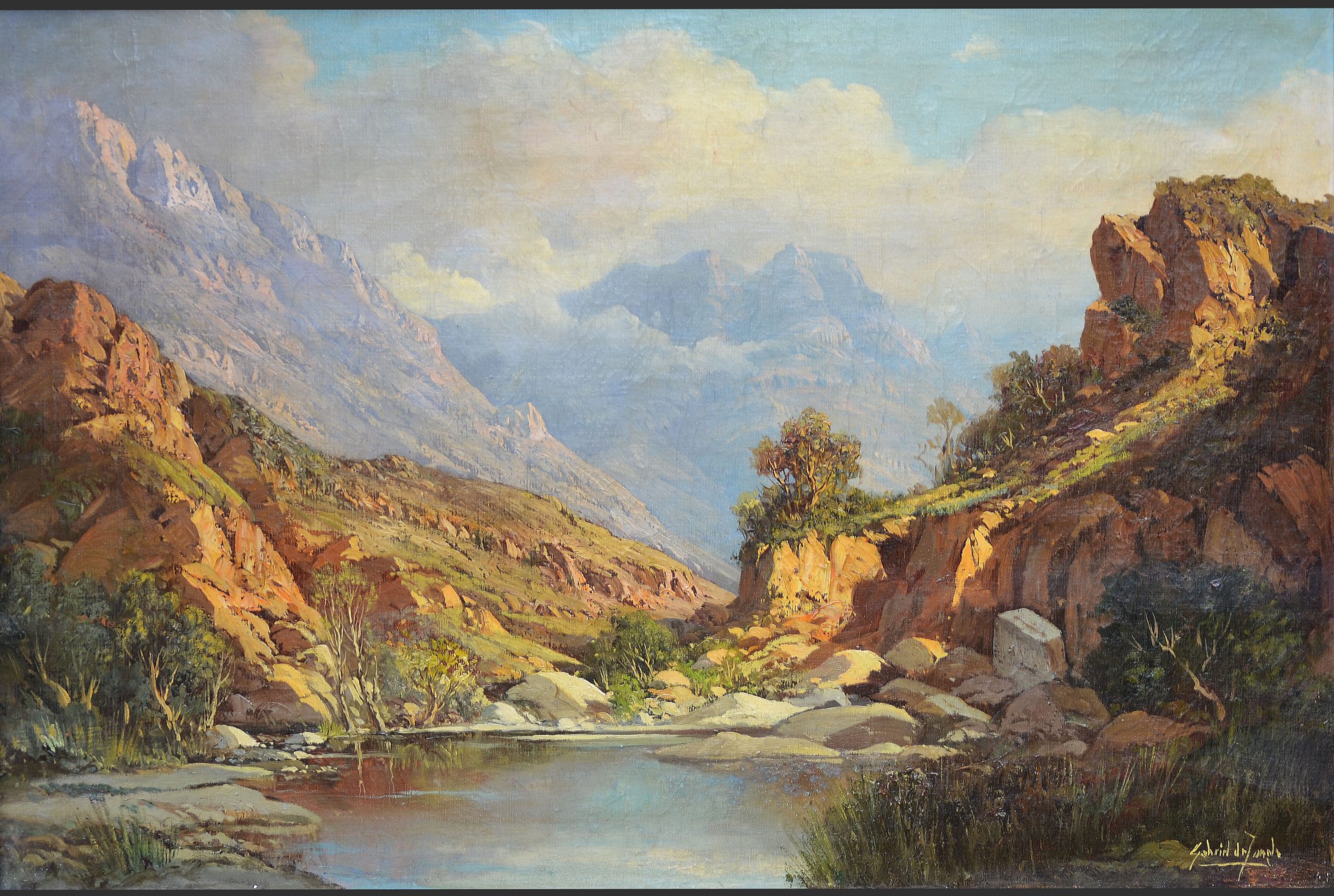 After being medically discharged, he returned to South Africa in June of 1945 and resumed his position at The Cape Times. Following the war, he shifted his medium to oil painting. De Jongh travelled extensively and visited Europe, South America, and East Africa, but his favourite subject remained the landscapes of the Western Cape.