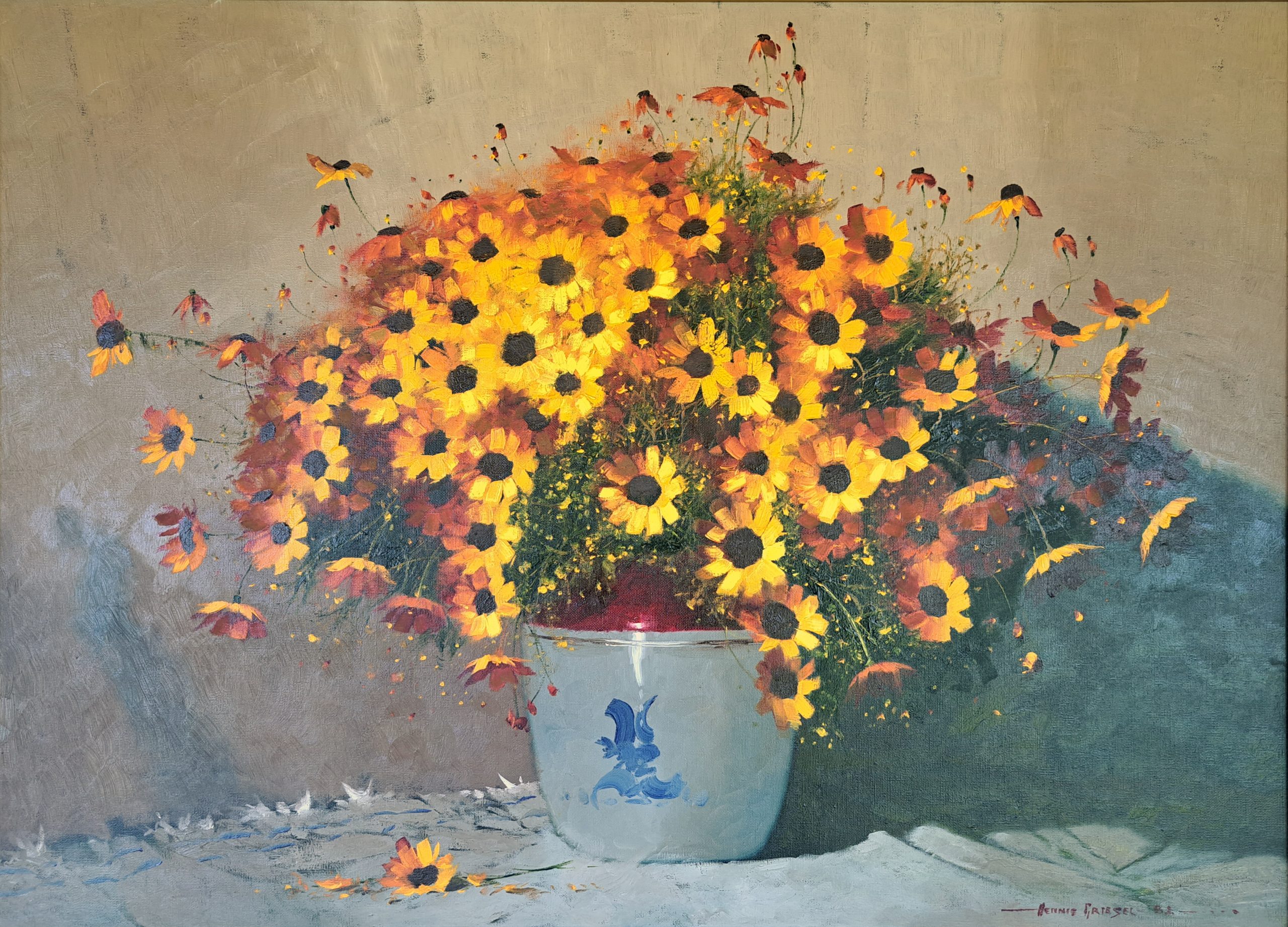 He never attended a single art class in his life and had no art tuition of any kind. Everything he delivered was pure talent. He did show signs of a love for art as a young boy in the Tzaneen district, and he started painting. He earned his money as a road worker driving bulldozers. His most popular work includes still lifes of copper and flowers, especially cosmos and sunflowers. His masterpieces of landscapes, animal studies, and architecture can be seen in houses and offices all over Taiwan, the USA, Israel, and France.