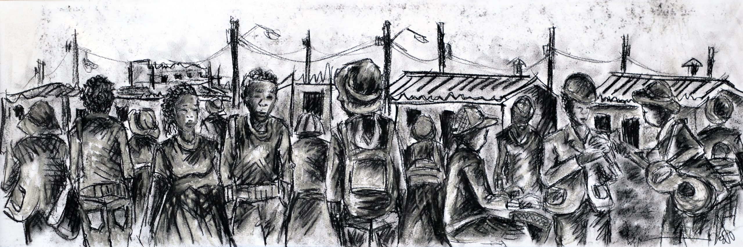 He is a self-taught artist, working predominantly in mixed media and charcoal, using pen, ink, watercolours, and acrylics. During the 2013 “Black Like Us” exhibition, Nthando was nominated as the best newcomer in the watercolour category. He exhibits in various galleries in Johannesburg, and his work has been sold to numerous foreign collectors.